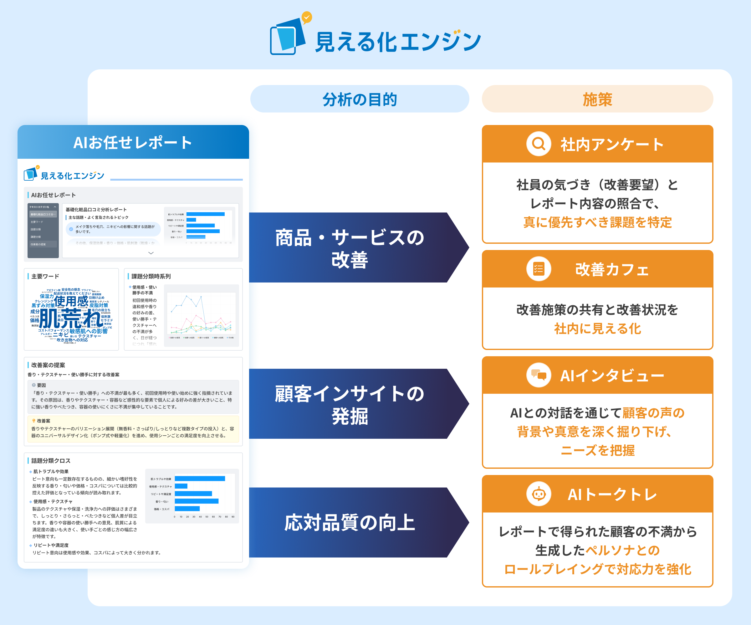 顧客の声活用プラットフォーム「見える化エンジン」 に、顧客ニーズ、改善施策のアイデアを分析し、レポートを自動生成する「AIお任せ分析レポート」機能を新規搭載~レポート業務効率化、顧客理解、アイデア発想まで、一貫した取り組みを支援~