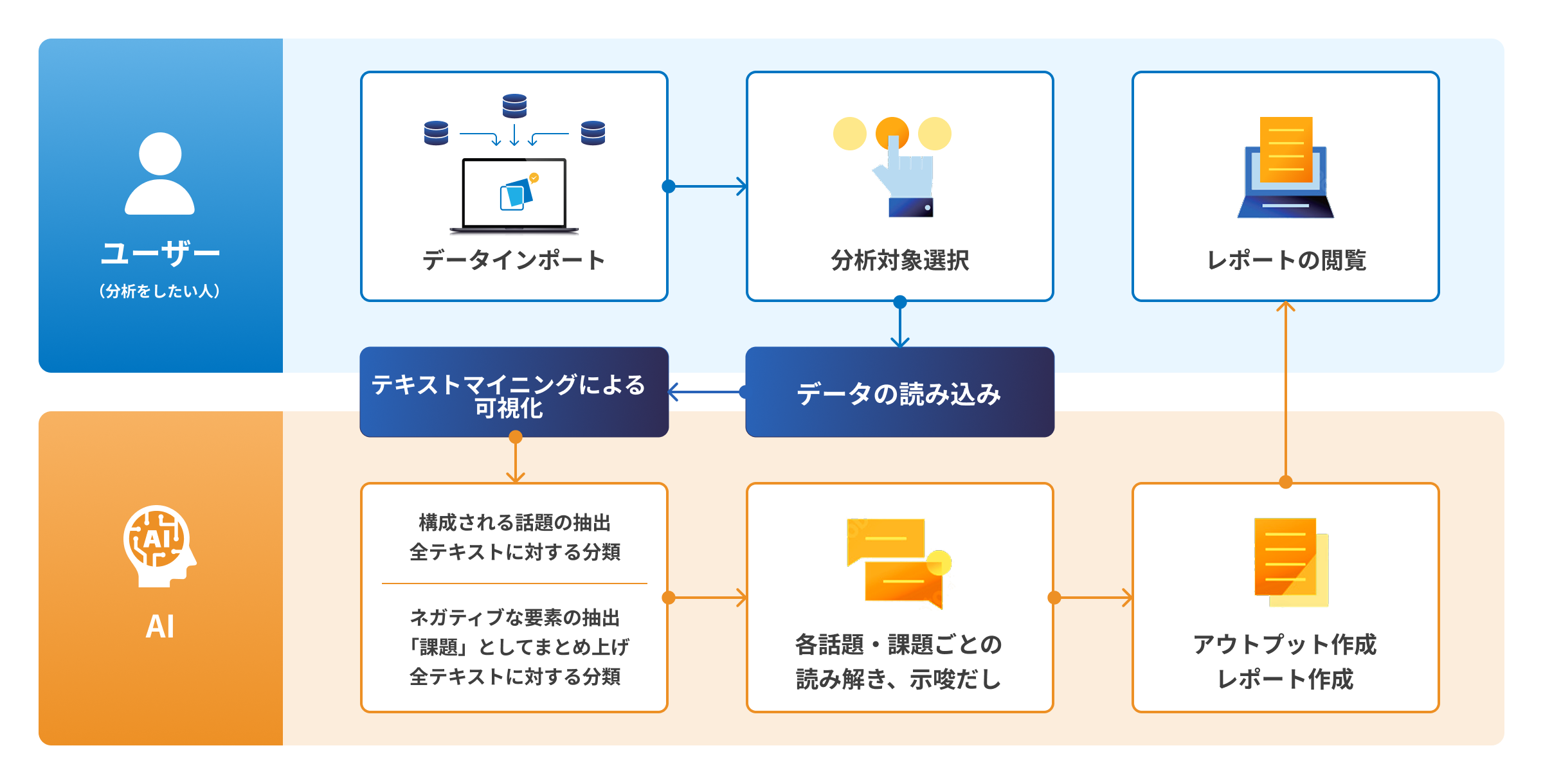 顧客の声データを取り込むだけで、AIとテキストマイニング技術を活用した分析レポートが自動生成されます。話題分類、課題分類、アウトプット生成、示唆の提示、レポーティングまでを一貫して行い、分析者の工数を大幅に削減します。